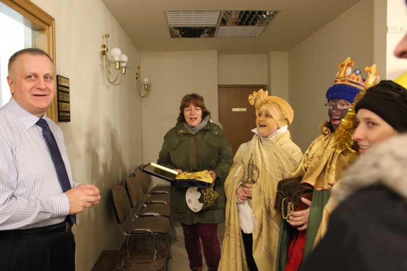 Podopieczni ogniska są częstymi gośćmi w Urzędzie Miasta i Gminy, gdzie przychodzą oglądać wystawy, ale we wtorkowe południe, 7 stycznia, zaskoczyli wszystkich swoimi strojami charakterystycznymi dla polskich kolędników i pięknie śpiewanymi kolędami. Tradycji stało się za dość. Był gwiazdor, a właściwie „gwiazdorka”, król Herod, Żyd, aniołki, diabełki z widłami, dziad i baba, przesympatyczna śmierć, wesoły turoń, milutka owieczka, niezbyt złe duchy i inne maszkary, które „strasznie” bawią swym wyglądem. Trzej królowie przyszli z darami i zupełnie nie przeszkadzało to, że zamiast: mirry, kadzidła i złota przynieśli, szkatułkę z koralami i pyszne pierniczki, którymi częstowali nie tylko włodarza naszego miasta. Roześmiani i rozśpiewani przynieśli też życzenia, które tradycyjnie są pomyślna wróżbą urodzaju i powodzenia.