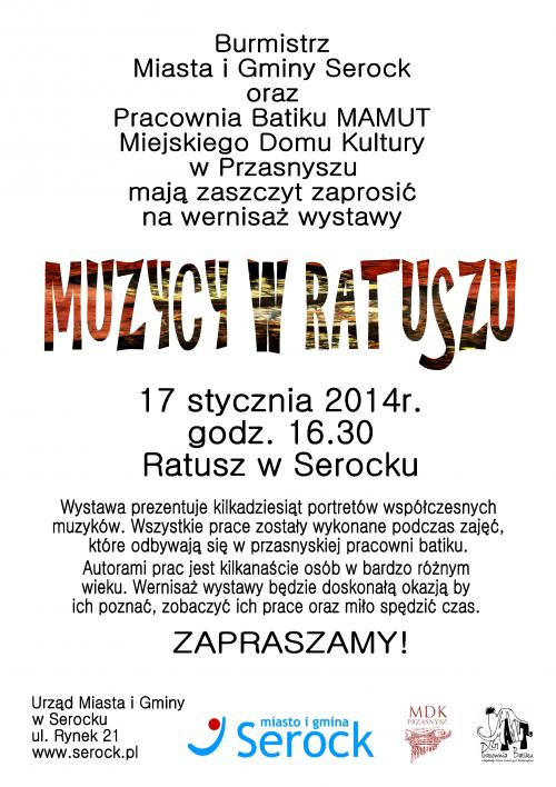 17 stycznia w serockim ratuszu została otwarta wystawa pt. „Muzycy w ratuszu”. Autorami prezentowanych prac, wykonanych techniką batiku jest grupa osób z pracowni batiku Mamut w Miejskim Domu Kultury w Przasnyszu.